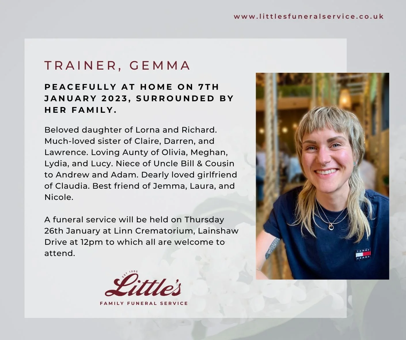 L&g learning will be closed on Thursday the 26th of January for the funeral of Gemma Trainer, our former colleague, our friend, and the daughter of our Director, Lorna Trainer.